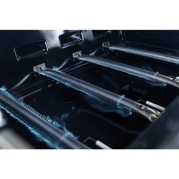 Even-heat system features angled flame tamers to distribute heat evenly prevent flare-ups and vaporize food drippings into smoky flavor infusions